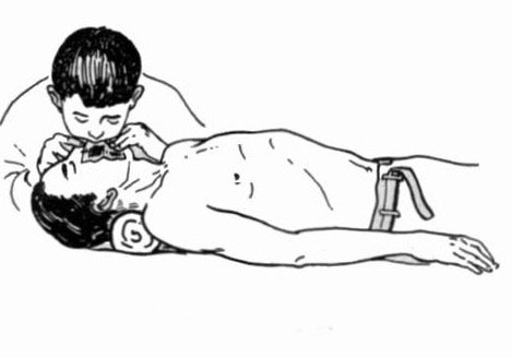 4保持病員頭部后仰的姿勢,令下頜部與耳垂的連線同地面基本呈90°,即氣道已充分打開。深深吸一大口氣,一手捏緊病員的鼻子,盡可能用嘴完全地包住病員的嘴巴,將氣體吹入病員的體內。同時眼睛要注視病員的胸廓是否有明顯的擴張,若有,表明吹氣量足夠多。隨即放開捏住病員鼻子的手,讓他自主完成一次呼氣過程。