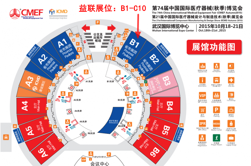 第74屆CMEF秋季益聯展位 B1-C10,2015.10.18-21 武漢國際博覽中心(武漢市漢陽區鸚鵡大道619號)上海益聯醫學歡迎新老客戶蒞臨指導、洽談合作。