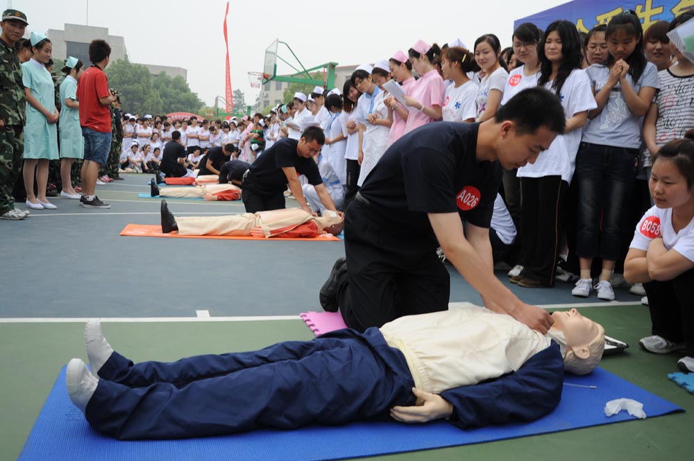 在大學生普遍急需普及培訓的急救技能中,心肺復蘇(cardiopulmonary resuscitation,CPR)列位。CPR開始的時間是心臟驟停急救成功的關鍵,在心跳停止4 分鐘內開始有效CPR將提高病人的存活率。但是,88.7 %的呼吸心跳驟停發生醫院以外的各種場所,其中 2/3 死于發病后的 15 分鐘。由于受到各種客觀條件的限制急救人員往往不能在理想的時間內到達事發地點。 所以,要提高CPR搶救的成功率,必須依靠全民參與。大學生作為一個特殊群體,處于非;钴S的年齡階段,對大學生進行CPR的培訓教育,再通過大學生對其周圍的人進行知識傳播會取得良好的社會效果。