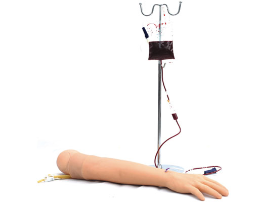,針管內出現回血。不一會,回血消失,輸液器內的液體緩緩流入手臂模型血管內。