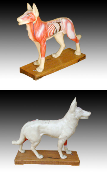 本模型顯示狗體左半部72個(gè)常用穴位,穴位用數(shù)字標(biāo)注。右半部顯示解剖面。用PVC制成,供獸醫(yī)作參考用。
