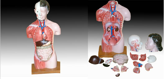 這是一款女性軀干模型,含15件內臟:軀干,頭(2件),腦,肺(2件),心(2件),胃,肝,胰和脾,腎,腸和女性生殖器官(2件)。用PVC制成,安放于塑料座上。尺寸:42 CM。