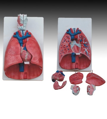 本模型自然大小,分成7件。兩瓣肺葉可取下示其內部結構。心臟縱剖示心房、心室和瓣膜。喉頭也分成兩件。置于底座上。尺寸:36x23x12CM.