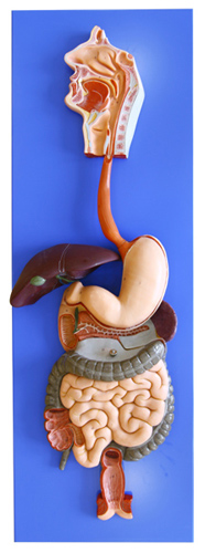 這是一款消化系統(tǒng)的立體模型,實(shí)物大小。展示:鼻,口腔和咽喉,食道,胃腸道,肝與膽囊,脾和胰,十二指腸、盲腸和直腸開(kāi)放。分成3件,置于基板上。