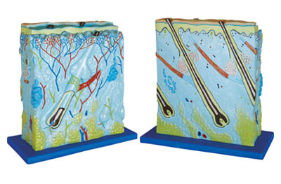 放大105倍的人體皮膚的橫截面模型。清晰地顯示了三層皮膚、頭發(fā)毛囊、汗腺、脂肪組織等。不可分割。尺寸: 27x10x31CM。用PVC制成,安放于塑料座上。