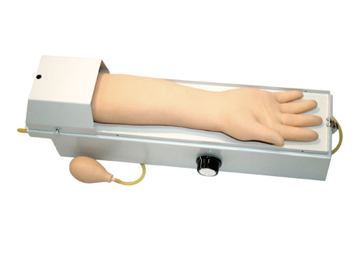 該模型是在模擬動脈血壓的情況下進行動脈抽血、動脈注射和動脈輸血等各種穿刺訓練。模型采用機械旋轉式移動橈動脈,可使穿刺損壞的血管移動,解決了經過穿刺后血管滲漏現象,這樣可反復穿刺操作訓練。適用于醫學院校、護理學院、衛生技術學院以及臨床醫務工作人員的動脈穿刺訓練的教學示教及學員操作訓練。模擬動脈血管損壞后可旋轉異動股橈動脈。手腕皮膚和血管破損可更換。模型由進口塑膠材料,不銹鋼模具,不銹鋼模具,經注塑機高溫注壓而成。具有結構合理、操作真實、牢固耐用、消毒清洗不變形等特點。主要功能:• 模型為手臂橈支脈,可進行動脈抽血、動脈注射或動脈輸血等操作訓練。• 用小皮球氣囊打氣提供模擬的動脈搏動及真實的動脈血壓。• 進針有明顯落空感,穿刺方法真確時有明顯的動脈回血產生。• 采用機械旋轉式可移動橈動脈穿刺破損部位。• 手腕皮膚和動脈血管破損后可更換。
